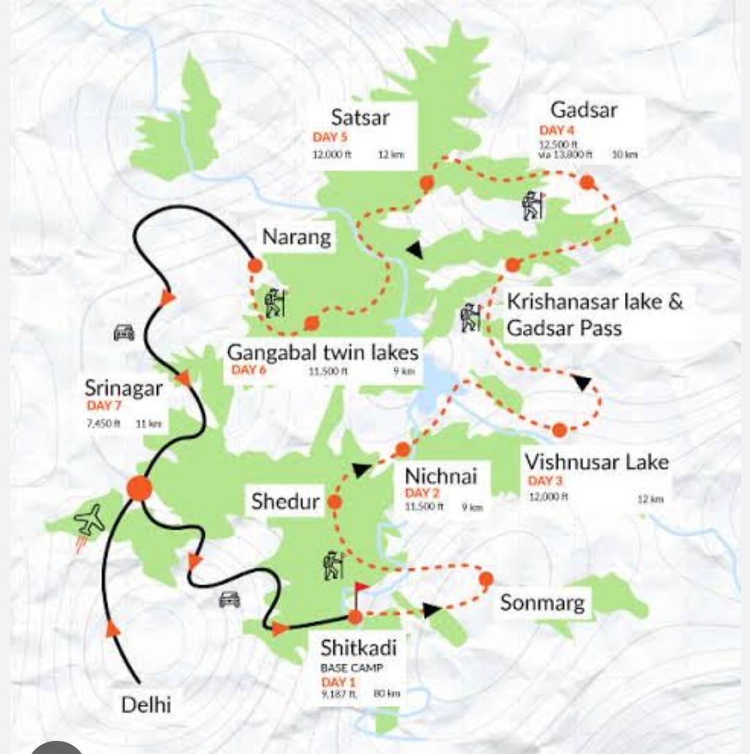 The journey begins with a scenic drive from Srinagar to Sonmarg, where snow fed rivers and towering peaks welcome you into the mountains. From Shitkadi campsite, the real trekking adventure begins. Gradually, you climb through forest patches, river valleys, and open grasslands before reaching some of the most beautiful alpine lakes in the region.
